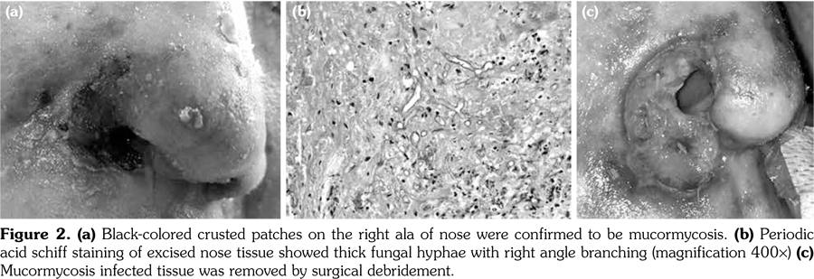 On the fifth day of hospitalization, she complained of cough and shortness of breath, and chest radiography showed consolidations in bilateral lower lung fields. Intravenous antibiotics were started for a presumed pulmonary infection. No microorganism was grown in the sputum, blood or urine, and further microbiologic tests were all negative for cytomegalovirus, aspergillus and Pneumocystis jirovecii. High- dose glucocorticoid was added for suspected concurrent lung involvement in newly developed SLE, but symptoms and lung infiltrations on computed tomography (Figure 1a) worsened and black-colored crusted patches occurred on the right ala of her nose (Figure 2a). On the 17th hospital day, the patient was transferred to the intensive care unit and placed on mechanical ventilator due to expected impending respiratory failure. A bronchoscopic exam showed bloody bronchoalveolar lavage fluid. Biopsy of the nasal lesion and histopathology confirmed mucormycosis