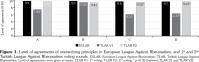 The level of agreements of EULAR 2016, the first TLAR voting results reflecting the agreement with the EULAR’s, and second TLAR voting results were presented in Figures 1 and 2. We changed three overarching principles, namely A, C, and D on detecting a statistically low agreement to EULAR among our expert committee. Despite not being evaluated as significant, 6th and 12th recommendations gained higher agreement than EULAR’s and 8th and 9th recommendations displayed lower agreement in TLAR voting. The 8th item for which a revision was offered by the expert panel attained a statistically significant difference after revision and the revised form was accepted. The remaining overarching principles and recommendations were accepted identically with the EULAR recommendations for the management of RA with sDMARDs and bDMARDs: 2016 Update.(6) The LoAs in the first and second TLAR voting rounds were given in Table 1 and the TLAR 2018 recommendations for the management of RA were presented in Table 2.