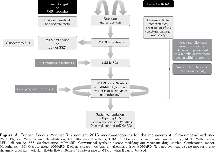 The European League Against Rheumatism (EULAR) has published several recommendations regarding management of RA in order to create a standardized care approach and provide physicians with practical information out of abundant trial results. The first recommendations of the EULAR were published in 2010, and updated in 2013 and 2016.(4-6) The American College of Rheumatology (ACR) also published a guideline for RA treatment in 2008 and updated these recommendations in 2012 and 2015.(7-9) Although these recommendations stand at the focus of the management of RA, the requirement of modification of the therapeutic algorithm may arise depending on the geographic location of a country, the characteristics of RA patients including lifestyle, environmental factors, and the operation of the healthcare insurance systems. Therefore, Turkish League Against Rheumatism (TLAR), a scientific member of the EULAR since 1947, developed recommendations for the management of RA in Turkey in 2011 and adapted the EULAR recommendations for the management of RA with synthetic and biological DMARDs into Turkish in 2013.(10,11) In this study, we aimed to report the assessment of the TLAR expert panel on the compliance and adaptation of the EULAR 2016 recommendations for the management of RA in Turkey. This is the third study to develop TLAR RA treatment recommendations based on EULAR recommendations to be used among Turkish rheumatologists and physical medicine and rehabilitation specialists taking care of RA patients.