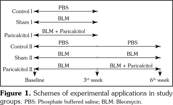 Results: Repeated BLM applications increased the dermal inflammatory cell infiltration and dermal thickness, and led to dermal fibrosis, in both early and late stages. Similarly, transforming growth factor-beta 1, axin-1, and Wnt-2 expressions were significantly increased in the sham groups compared to the own control group (p<0.05 for all). Contrarily, prophylactic and therapeutic paricalcitol applications decreased the transforming growth factor-beta 1, axin-1, and Wnt-2 messenger ribonucleic acid expressions compared to the own sham group (p<0.05 for all). In addition, the regressions in dermal necro-inflammation and dermal fibrosis on pathological views were also observed in the paricalcitol applied groups.