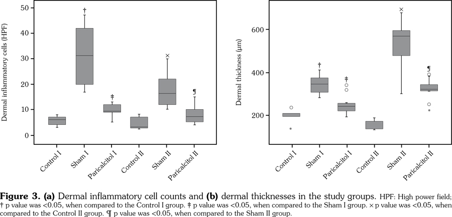 In the prophylactic paricalcitol group, the mean inflammatory cell count (34.1±9.4 vs. 9.9±2.6, p=0.001) and the mean dermal thickness (354.1±39.8 vs. 248.9±50.5 μm, p=0.007) were decreased when compared to the sham I group (Figures 2 and 3). Moreover, therapeutic paricalcitol applications decreased the mean inflammatory cell count (18.2±7.5 vs. 8.3±4.1, p=0.005) and dermal thickness (527.1±98.5 vs. 319.1±56.5 μm, p=0.003) when compared to the sham II group (Figure 2).