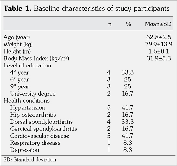 Baseline characteristics of the participants were described in Table 1. Of the 15 participants eligible for the study, 15 (100%) completed the baseline testing and received the intervention. With regard to retention rate, three participants withdrew before the final assessment. The reasons given included being on vacation at the time of the second assessment (n=2) and exacerbated pain due to a fall not related to the program (n=1). Therefore, 12 participants (80%) completed the program.