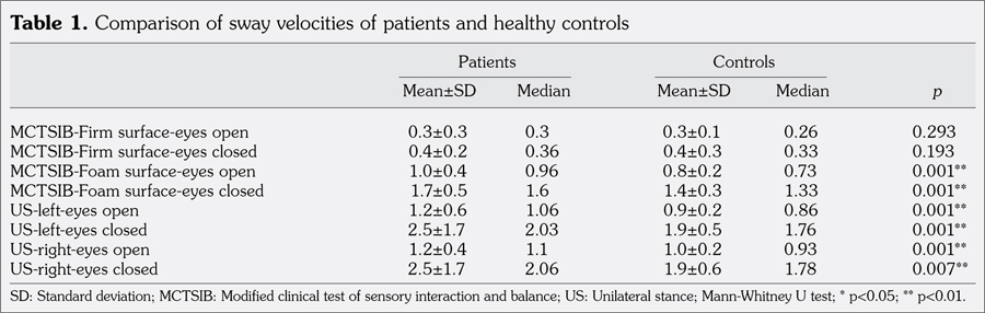 Regarding the patients’ postural SV (degrees/ second) under sensory conditions on a firm surface, no significant difference was evident in the mean velocity between the groups (p>0.05). However, the control group had significantly higher mean levels when the test was performed on a foam surface with eyes closed or open (p<0.01). For the unilateral stance, the patient group had a significantly higher mean SV compared with the control group (p<0.01). The patient group also had a significantly higher mean SV while standing on the right foot with eyes closed or open (p<0.01) (Table 1).