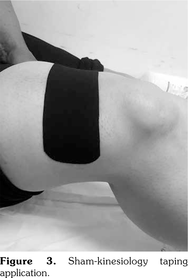 For the vastus lateralis muscle, with the hip in a neutral position, after applying the tape without stretching from the trochanter major towards the distal thigh, one end of the tape was taken to the fibula head and the other end was attached to the lower edge of the patella by passing lateral to the patella (with full stretching). For the vastus medialis muscle, with the hip in a neutral position, after attaching the tape from the distal third of the thigh as far as the patella medial without stretching, the knee was taken into flexion and one end of the tape was taken towards the medial tibia and the other was passed around the medial patella (with full stretching) and the tape was attached to the lower edge of the patella. The tapes were applied throughout three weeks and were changed at intervals of three to seven days.