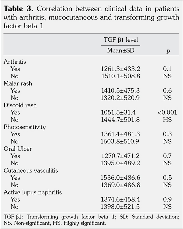 Results: Mean serum TGF-β1 level of patients with SLE was 1385.7±483.1 pg/mL, with a significant difference compared to control group (2079.6±125.4 pg/mL; p<0.001). TGF-β1 was statistically significantly correlated with SLE disease duration. However, there was no statistically significant correlation between TGF-β1 and erythrocyte sedimentation rate, C-reactive protein, 24-hour urinary protein, complement 3, serum cholesterol, low density lipoprotein, or serum triglyceride. TGF-β1 was statistically significantly correlated with discoid rash. There was a statistically significant correlation between SLE Disease Activity Index and serum cholesterol, and triglyceride.
