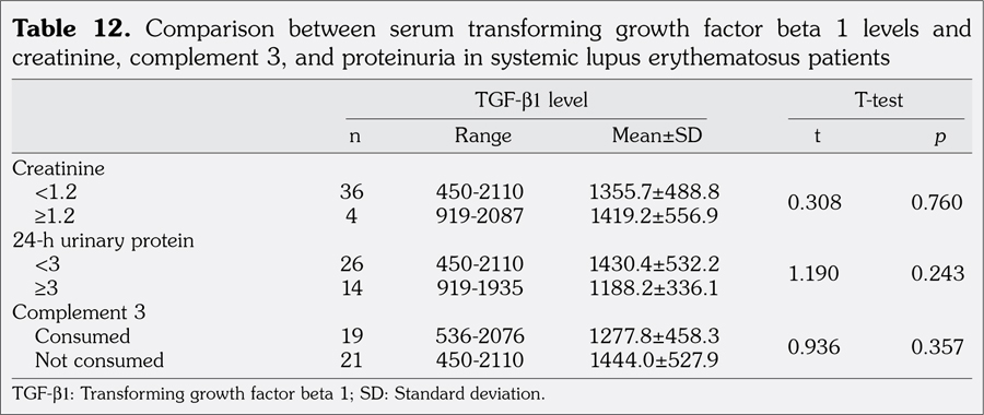Transforming growth factor-beta 1 was not statistically significantly correlated with serum cholesterol, triglyceride, or LDL levels in the control group (p>0.05) (Table 10). There was no statistically significant difference in TGF-β1 level between patients with high or low disease activity, between those with proteinuria of >3 g or <3 g, and between those with serum creatinine of >1.2 g/dL or <1.2 g/dL (Table 11, 12, 13).