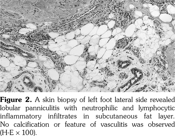 In conclusion, although panniculitis in JDM is not apparent clinically and is rarely reported, the subclinical changes in the subcutaneous tissue of JDM frequently exist. It may present concurrently with the onset of JDM or a few months later. Therefore, if a patient with JDM manifests with erythematous, painful, indurated eruptions, JDM-associated panniculitis should be considered a possibility. The correlation between histologic findings and clinical course is required to be established in JDM-associated panniculitis, since timely diagnosis and treatment may reduce the pain and improve the quality of life of patients.