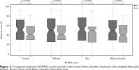 Results: After one week of treatment, decreased Western Ontario and McMaster Universities Osteoarthritis Index overall scores and sub-scale scores were observed in the whole cohort (p<0.005) and Kellgren-Lawrence scale grade 3 group (p<0.05). In the Kellgren-Lawrence scale grade 2 group, overall Western Ontario and McMaster Universities Osteoarthritis Index scores and pain and functional ability sub-scale scores improved (p<0.05).