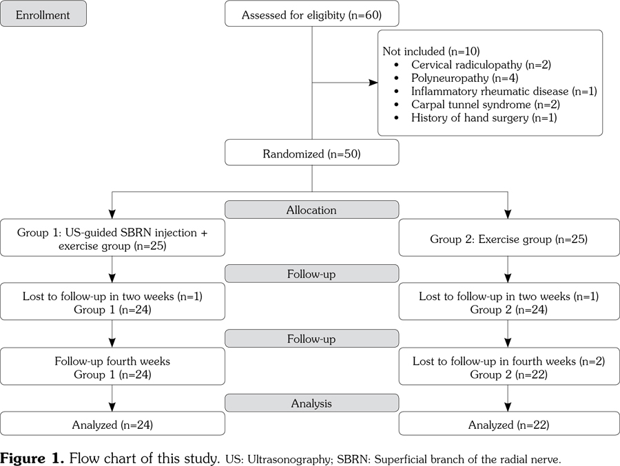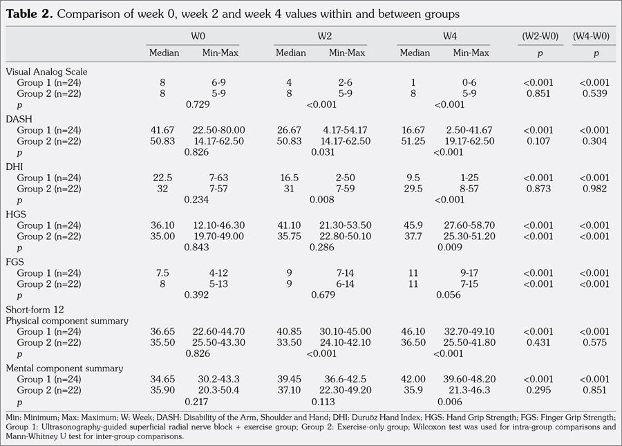 Patients and methods: In this prospective, randomized and controlled single-blind study, 50 female patients (mean age 59.0±5.1 years; range, 46 to 64 years) diagnosed with hand osteoarthritis were randomized into two groups. Group 1 (n=25) was administered an ultrasound-guided superficial branch of the radial nerve injection (with a combination of 2 mL 0.25% bupivacaine and 1 mL methylprednisolone acetate) + exercise, while group 2 (n=25) only exercised. Patients were assessed with a visual analog scale for pain, hand grip strength, finger grip strength, Quick Disability of the Arm, Shoulder and Hand questionnaire, Duruöz Hand Index and Short-form 12. Data were obtained before treatment (W0), in the second week after treatment (W2) and in the fourth week after treatment (W4).
