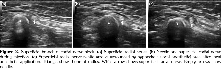 A SBRN block has been used previously in many studies. Henshaw et al.(37) achieved significant pain relief using a continuous local anesthetic infusion of SBRN in a 46-year-old female with type II complex regional pain, secondary to upper extremity trauma, and suggested SBRN block as an alternative treatment method in patients with similar symptoms. An US-guided SBRN block has also been suggested in cheiralgia paresthetica that resulted from entrapment of the SBRN.(38)