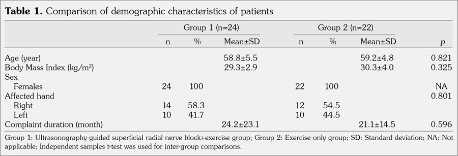 The distributions of age, sex, Body Mass Index, affected hand and complaint durations of the patients are presented in Table 1. The pre- treatment evaluations of the parameters in both groups are presented in Table 2. No statistically significant difference was identified between the two groups regarding demographic characteristics or pre-treatment evaluation parameters (p>0.05).