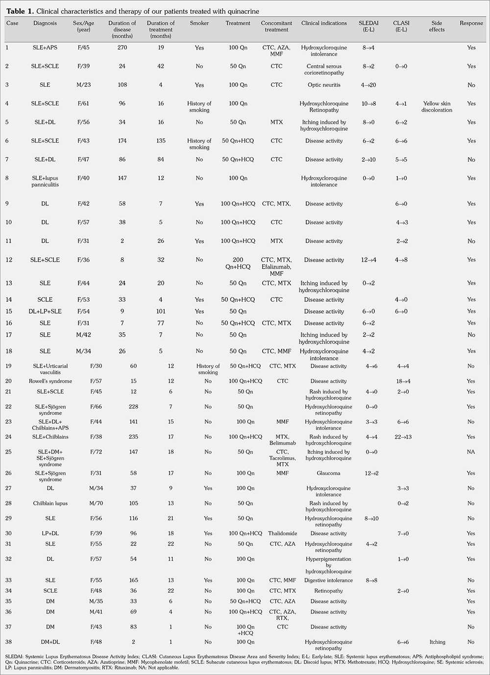 Patients and methods: The study included 38 patients (6 males, 32 females; mean age 45±8 years; range, 23 to 72 years) with systemic lupus erythematosus (SLE), cutaneous lupus or DM who had been treated with Qn. The following data were obtained from the records of each patient: sex, age, diagnosis, duration of the disease, duration of treatment, smoking behavior, antimalarial treatment, concomitant treatment, and clinical indications, as well as Systemic Lupus Erythematosus Disease Activity Index (SLEDAI) and Cutaneous Lupus Erythematosus Disease Area and Severity Index (CLASI) activity before initiation, at the last visit, or when Qn treatment was completed. We carried out a MEDLINE search for previously reported cases that, together with our patients, served as the basis of this report.