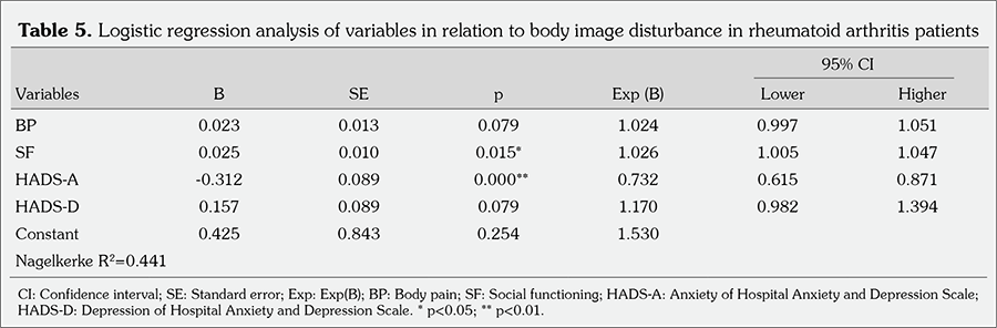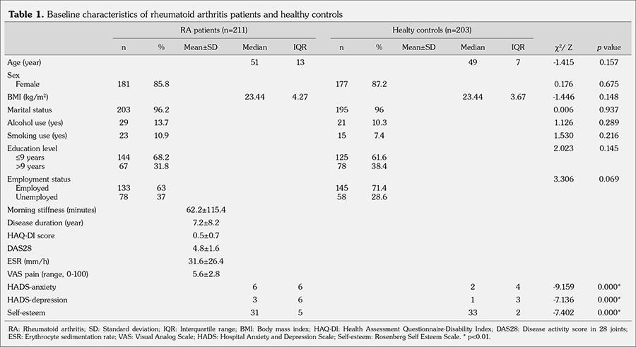 Patients and methods: A total of 211 RA patients (30 males, 181 females; mean age 50.4±12.4 years; range, 20 to 81 years) and 203 age-matched healthy subjects (26 males, 177 females; mean age 49.6±5.6 years; range, 34 to 64 years) were included in this study. Patients were assessed by Body Image Disturbance Questionnaire (BIDQ), Visual Analog Scale, Health Assessment Questionnaire-Disability Index, disease activity score in 28 joints, Short Form 36 health survey, Hospital Anxiety and Depression Scale, Rosenberg Self-Esteem Scale and erythrocyte sedimentation rate.
